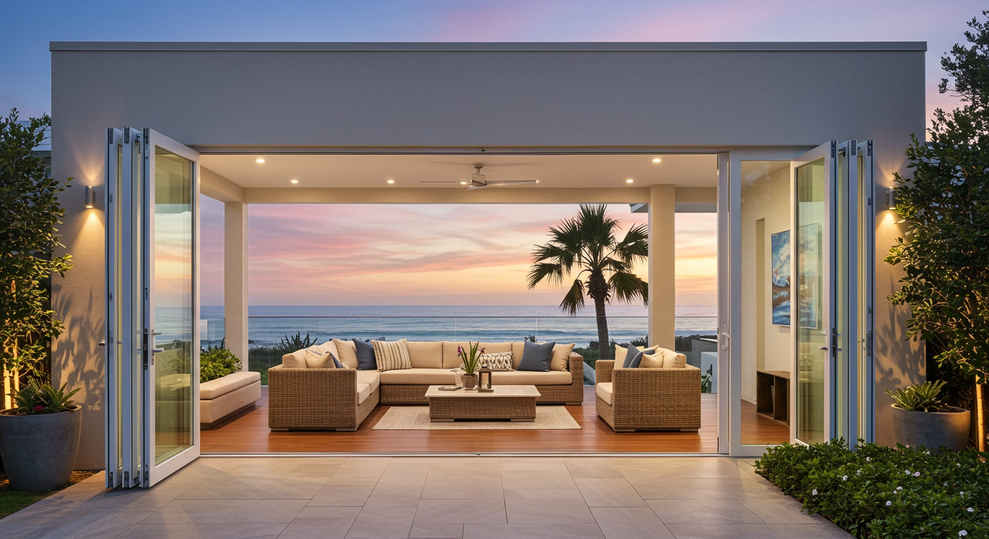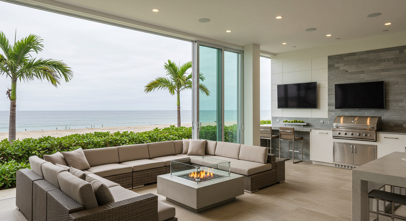 Indoor/outdoor living takes center stage with 9 x 12 La Cantina doors that open up to outdoor banquette seating, custom water feature, BBQ, serving bar, decorative glass fire pit, and 70” ultra-high def LED smart TV.