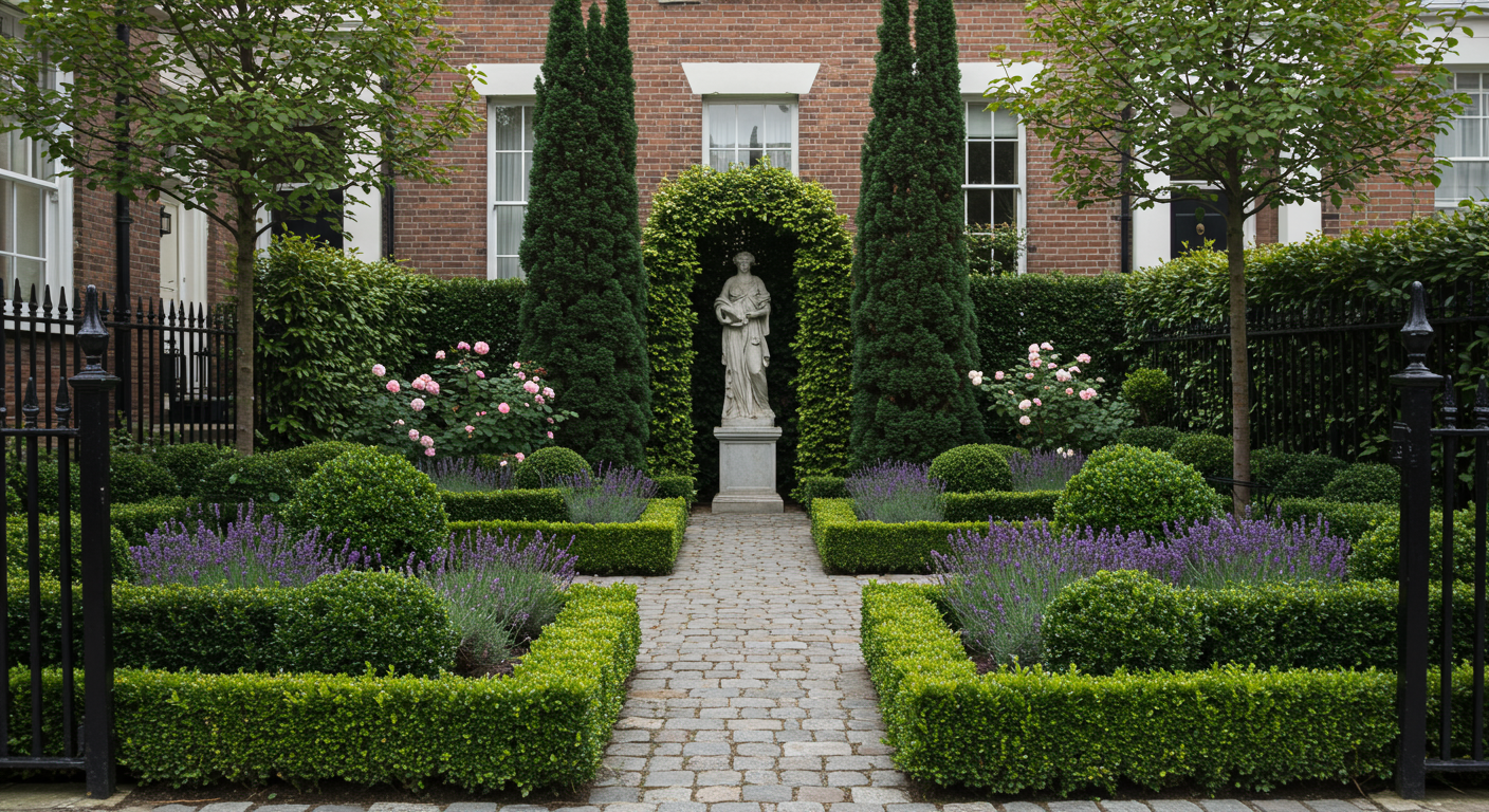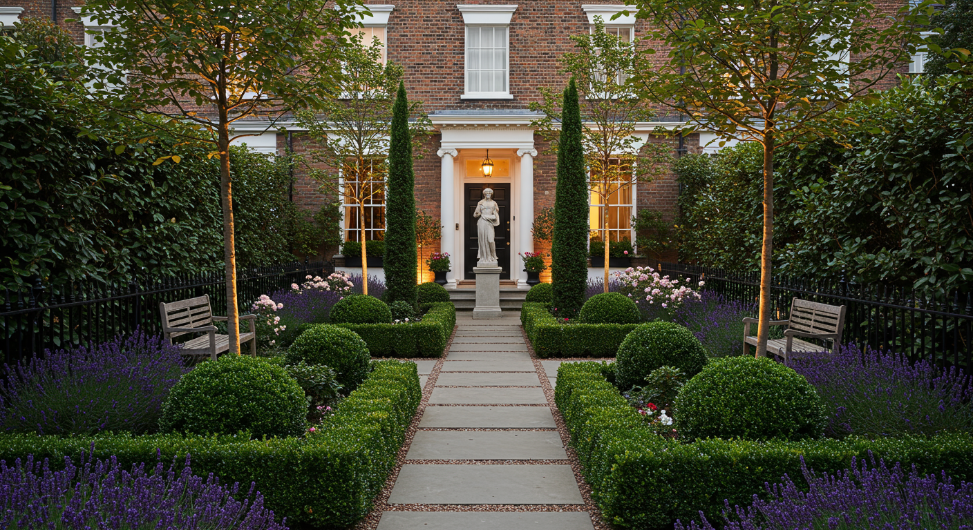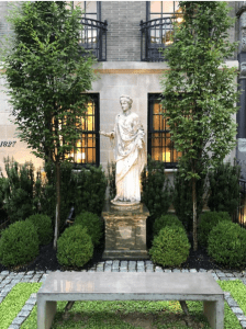 We set the statue slightly behind a pair of European hornbeams to create a grotto effect, and low-voltage lighting washes the restored façade and the statue with soft light at night. We worked hard on every detail from plant selection to customizing the new house numbers. It only took us three tries to get those right!